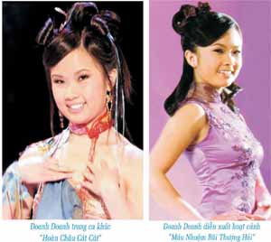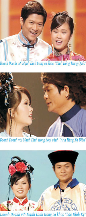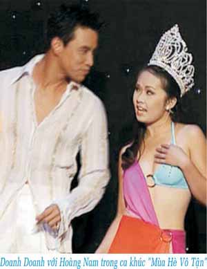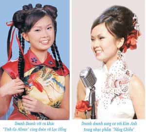 Doanh Doanh: Cám ơn chú. Lần đầu tiên cháu được vinh dự trình diễn trên một sân khấu to lớn như thế quả thật cháu có hồi hộp chứ, nhưng may quá bên cạnh có anh Hoàng Nam, một ca sĩ nổi tiếng đã tận tình trấn an cháu nên cháu lấy lại sự bình tĩnh trong vài giây trước khi ra trình diễn.