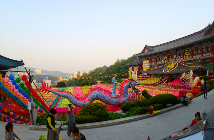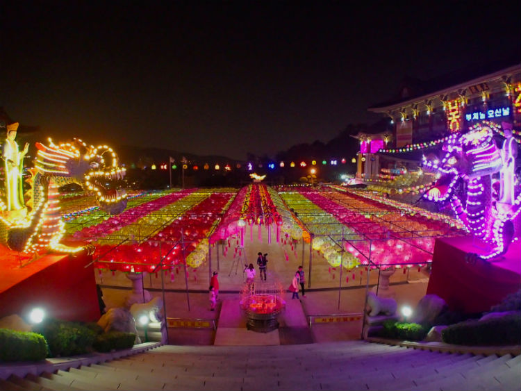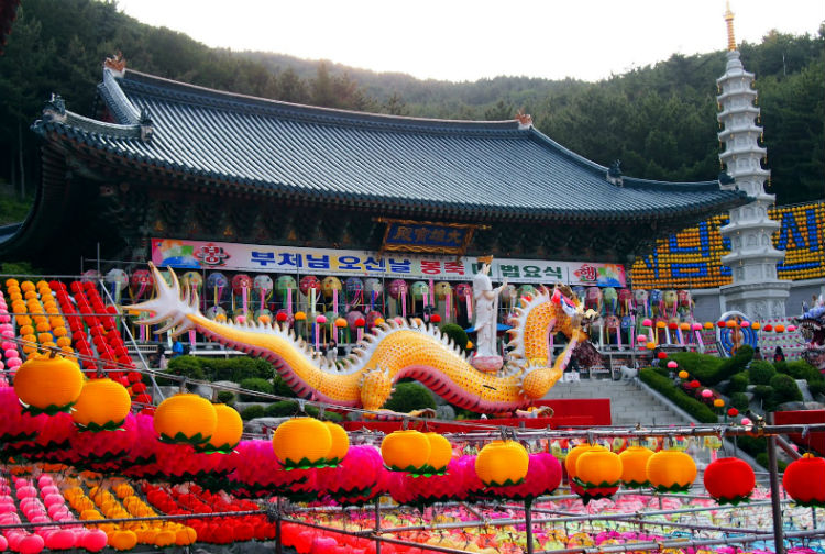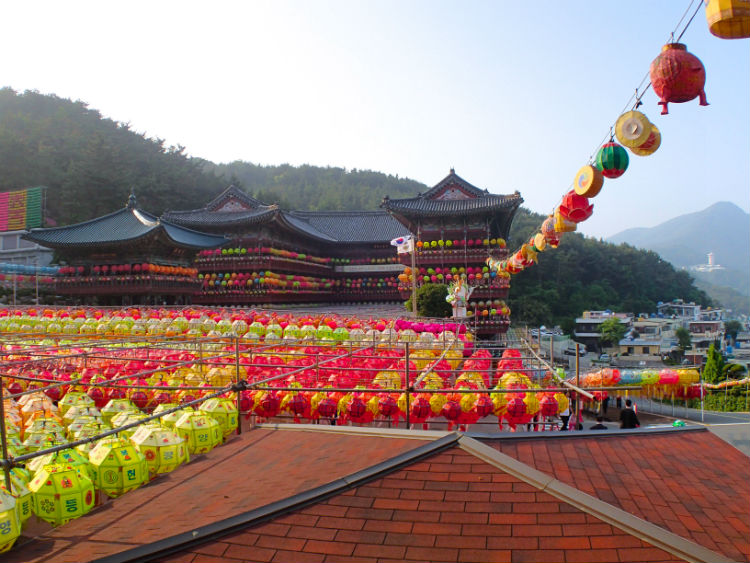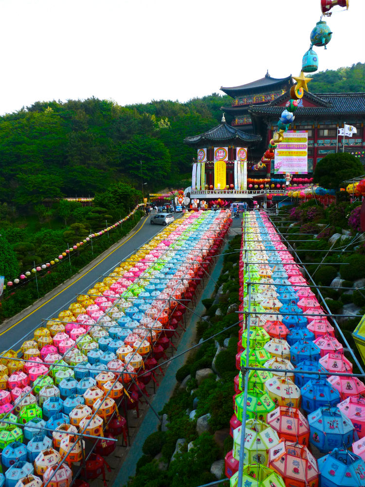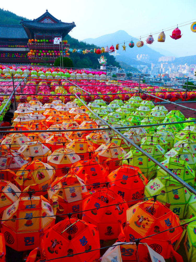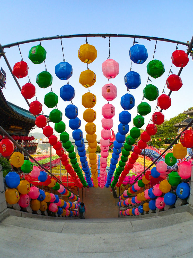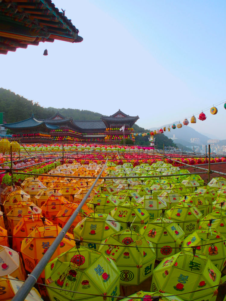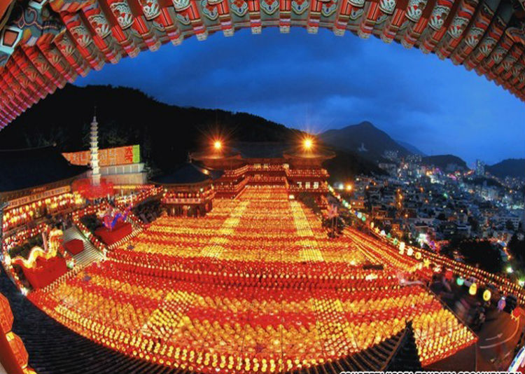 Để chào mừng ngày Đức Thích Ca đản sanh, hàng ngàn chiếc đèn lồng màu sắc rực rỡ được xâu thành chuỗi, đan lên nhau giăng trên khắp chùa ờ thành phố Busan. Những chiếc đèn lồng này tượng trưng cho lễ kỷ niệm ngày Đức Phật ra đời với nhiều hình dạng của hoa sen và là một trong những họa tiết được công nhận là của văn hóa Phật giáo Hàn Quốc.