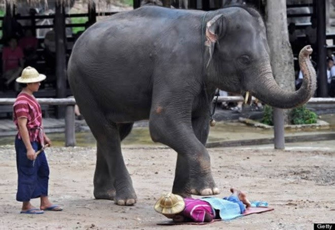Đối với những người đang bị đau vùng thắt lưng, thì massage voi là ý tưởng tuyệt vời. Những chú voi nặng 3 tấn tại một công viên du lịch ở Chiang Mai, Thái Lan, được huấn luyện để giẫm chân nhẹ lên lưng bạn.