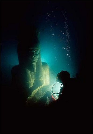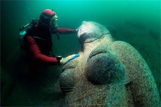 1. Nhà khoa học Franck Goddio và nhóm thợ lặn đang kiểm tra một bức tượng Pharaoh. Bức tượng làm bằng đá hoa cương màu đỏ có chiều cao hơn 5 mét, được tìm thấy gần ngôi đền lớn của Heracleion dưới đáy biển.