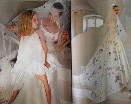 Angelina Jolie diện váy cưới của nhãn hiệu Versace và được trang trí bởi chính những bức tranh và dòng chữ nguệch ngoạc viết bằng tay của các con trong hôn lễ bí mật tại Pháp, ngày 23/8 vừa rồi.
