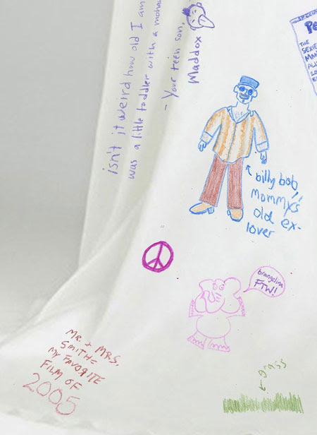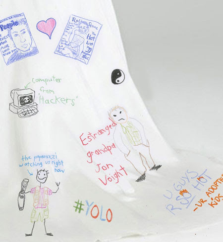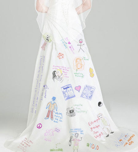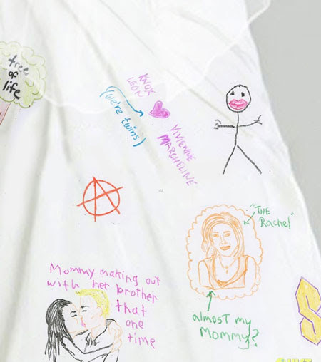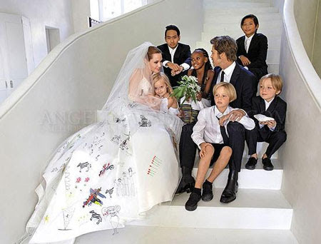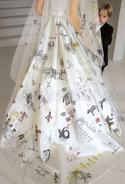 Chiếc váy cưới của Angelina Jolie kín đặc những bức tranh của sáu đứa con. Trong đó, tụi trẻ vẽ hình nam diễn viên 75 tuổi Jon Voight - cha ruột của Angelina Jolie và gọi ông là "người ông xa lạ". Tụi trẻ còn biết tới Billy Bob, chồng cũ của Angelina Jolie. Cậu con trai nuôi Maddox còn viết tặng cha mẹ những dòng rất tình cảm.
