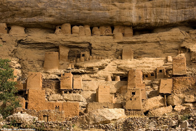 Ngôi làng đất sét cheo leo sườn vách núi:Thổ dân người Dogon sống quần cư trong ngôi làng với những ngôi nhà làm từ đất sét nung, treo mình trên vách núi Cliff of Bandiagara, Tây Phi. Đây là vùng cao nguyên kết hợp giữa núi và đồng bằng có thành phần cấu tạo địa chất chính là đất sét đỏ. Ngôi làng là quần thể chuỗi các ngôi nhà, kho lương thực, khu bảo tồn, ủy ban hoàn toàn làm từ đất sét đỏ nung cứng như gạch vô cùng kỳ thú, độc đáo.
