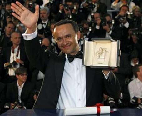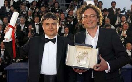 Đạo diễn người Rumani Cristian Mungiu (trái) với giải thưởng Cành Cọ Vàng