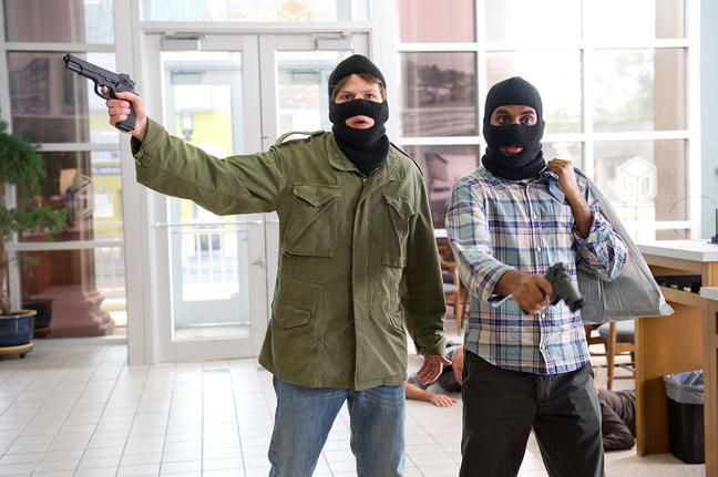Vào ngân hàng địa phương, hai anh bịt mặt nên không ai nhận ra, nhưng anh biết tất cả khách lẫn nhân viên. Nick ra lệnh cho cô nhân viên dẫn anh vào kho bạc. Cô ta run sợ làm theo, hốt đầy tiền vào cái túi cho hai người. Khi ra đến cửa, một nhân viên vô tình bị trúng đạn, Nick cảm thong, móc một sấp bạc tặng lại cho anh ta, coi như bồi thường thiệt hại. Không ngờ, bó bạc là đồ zổm, (loại tiền để nhân viên ngân hàng phòng hờ bị cướp). Anh ta cầm lên phẩm mầu xịt đầy mặt. Nick hung hăng, bắt cô gái vào kho, đổi lại tiền tươi khác. Sau khi hai chàng ra xe còi hụ báo động mới ré lên ầm ĩ.