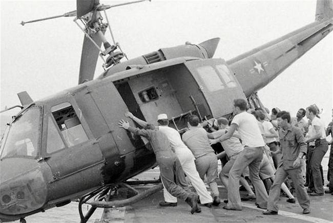 Hàng nghìn người chen lấn trước cửa sứ quán Mỹ ở Sài Gòn, Hình ảnh đoàn người xếp hàng leo thang lên sân thượng nóc toà Toà Đại sứ Mỹ ở Sàigòn là biểu tượng ê chề của người Mỹ khi những chiếc trực thăng bốc người Mỹ và một số người Việt Nam rời khỏi Việt Nam.