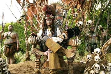 Nhóm Will Turner có một chiếc tầu tương đối, có thủy thủ hẳn hoi, họ cùng hướng về vùng biển Caribbean đi tìm jack Sparrow. Theo dấu vết Jack, Will tiến vào bờ một đảo hoang. Mới lên bờ trọn vẹn thủy thủ đoàn bị mọi ăn thịt người bắt không còn một mống. Chúng trói thúc ké, xỏ xâu khiêng về sào huyệt để chuẩn bị nướng BB Cue. Will bị đem lên dàn hỏa trình diện hội đồng xã, chờ đem ra nướng tái. Nhìn lên ghế tù trưởng, Will thấy không ai khác hơn là cha nội Jack Sparrow. Mặt mũi hắn vẽ rồng vẽ rắn, mặc đồ mọi, nói tiếng mọi linh tinh. Jack rời ngai vàng xuống gần Will, xem củi lửa sẵn sàng chưa để chàng chọn miếng thịt đầu tiên. Will la hoảng: “Mày là thằng thổ tả, tao và Elizabeth cứu mày, nàng đang bị tù vì mày chôm đồ của lãnh Chúa, mày phải giúp tao đem cái trả hải bàn về để cứu mạng vợ tao”. Chàng ca bài con cá tiếp: “Không ngờ giờ này mày lại là tù trưởng mọi, đưa bạn bè lên lò nướng mà xơi sao đành”.