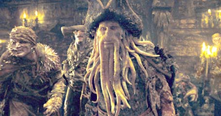 Trên đường đi giải cưú Jack, Captain Barbossa, Will Turner và Elizabeth đã đụng độ với con tầu ma, Flying Dutchman chỉ huy bởi captain Davy Jones. Ông này không biết phải là người hay quỉ vì mặt là một con bạch tuộc, những cọng râu bạch tuộc muá may linh tinh trông rất ghê tởm. Con tầu ma chưá toàn những hình thù quái đản hoá kiếp từ những hải tặc đã chết tự bao giờ. Trong đó có cả ông bố của Will Turner đã trở thành vách tầu với nghêu sò ốc hến bám đầy mặt mũi, da thịt. Mỗi khi được lệnh, vách tầu hiện hình thành nhũng quỉ quái xuất đầu lộ diện tàn sát moị vật cản đường đi của họ.