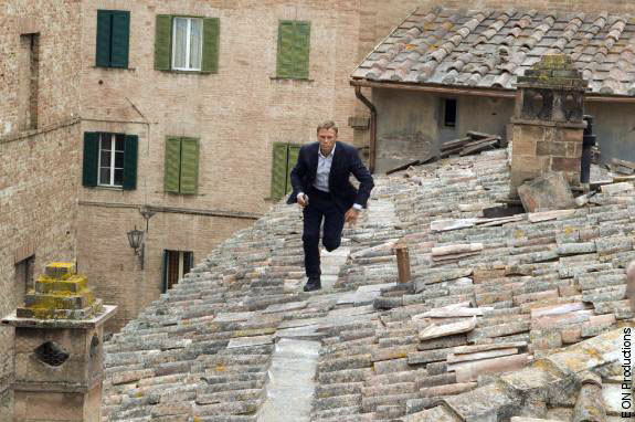 "Quantum of Solace" mở đầu với cảnh rượt xe qua các ngã đường quan quèo trên xa lộ nghịch chiều, ghềnh đá chênh vênh, đường hầm hiểm trở. Mấy xe khác cũng luồn lách, gài bẫy, bắn xối xả về khiá James Bond. Hành trình kéo dài từ Nice qua Monte Carlo, xuyên qua Portofino, Ý Đại Lợi và dừng lại ở một lâu đài cổ kính sau khi loại hết địch thủ. Chiếc Alfa Romeo, lúc khởi hành bóng loáng, lộng lẫy, tới nơi nó gần như đống sắt, mất cánh cửa và bẹp dúm tứ tung.