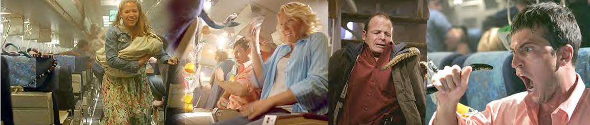 Trong phòng lái phi công phụ leo xuống hầm kiểm soát máy, luà tay vào phía sau máy điện toán chaeck giây điện, bị một con rắn mổ vào tay, con khác mổ vào cổ, nằm vật xuống sàn, xùi bọt mép chết ngắc. Claire và Neville vào phòng lái hỏi thăm phát giác ra phi công phụ đã chết. Phi công chính nhờ Neville xuống mở máy điện phụ. Anh khám phá ra các thùng đựng hoa bị quân gian bỏ đầy rắn và xịt thuốc kích thích làm cho chúng hung hăng đi tấn công người.