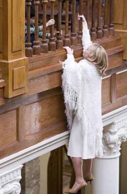 thành lan can. Katherine kêu cứu. Damien tỉnh bơ nhìn thẳng vào mắt Katherine từ