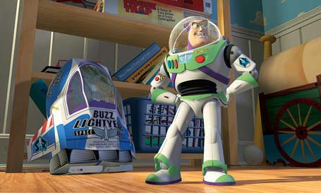 Woody ưu phiền hơn cả vì chắc chắn ngôi vị hàng đầu của nó sẽ mất về tay Buzz Lightyear. Buzz đến ra mắt với các bạn đồ chơi cũ, trước là tỏ lòng thân thiện sau là khoe tài của mình. Buzz biểu diễn cho moị người các mệnh lệnh phi hành không gian. Nó say sưa đưa ra hết độc chiêu làm cho các bạn lỗi thời chóa mắt. Cuối cùng muốn biểu diễn khả năng bay, Buzz kêu gọi tất cả ra xem. Nó leo lên chót ngọn cầu thang, bấm nút, hai cánh từ từ chui. Âm thanh phản lực rít lên nghe thật hấp dẫn. Buzz bấm nút nói chuyện với tổng đài, báo cáo phi vụ rồi lao mình ra không trung. Thế nhưng Buzz rơi vùn vụt xuống sàn nhà một cái “bịch”, cánh tay, ống chân sút ra chỏng chơ. Moị người được một mẻ cười hả hê. Buzz quê xệ, Woody ra tay nghĩa hiệp chạy đến ráp lại những phần thân thể bị sút ra và an ủi Buzz.