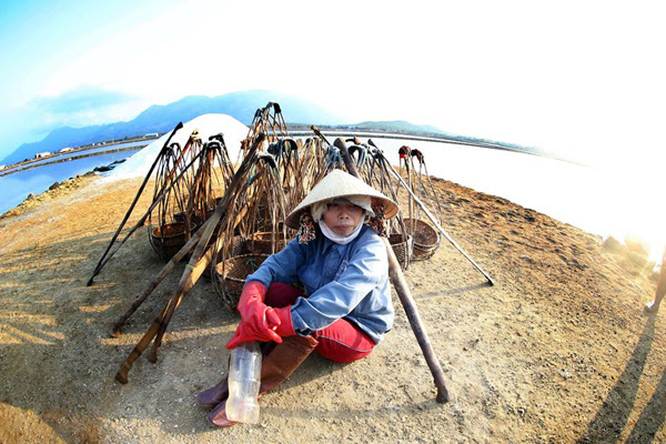 Hình ảnh mưu sinh vất vả của diêm dân trên ruộng muối chát mặn ở Hòn Khói, Khánh Hòa đã được du khách lưu lại khi đến đây.