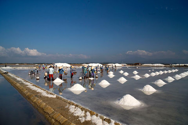 Đến đây, du khách có thể tận mắt chứng kiến một ngày làm việc của diêm dân trên các ruộng muối. Ngay từ lúc gà chưa gáy, những diêm dân này đã phải ra đồng để bắt đầu cho một ngày làm bạn với muối.