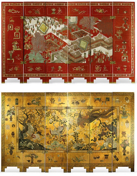 Trên đây là một bức tranh sơn mài hai mặt được tạo thành từ 6 tấm gỗ ghép, một mặt khắc họa đoàn rước trong cung đình Huế và một mặt khắc họa cảnh quan mùa xuân. Tác phẩm do thầy trò Joseph Inguimberty cùng thực hiện ở trường Cao đẳng Mỹ thuật Đông Dương.