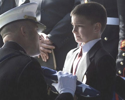 Hình ảnh đẹp mô tả cảm xúc của cậu bé Christian Golczynski 8 tuổi lúc nhận lá cờ từ quan tài của cha mình – người lính hải quân đã hy sinh trên chiến trường khi đang làm nhiệm vụ