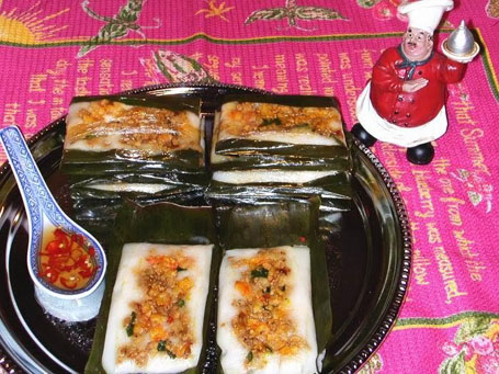 Khi gói bánh, xếp một lá (cỡ lớn hơn bàn tay một chút) nằm dọc phía dưới, một lá nằm ngang phía trên, thoa dầu ăn lên lá để chống dính, rồi múc một muỗng bột vào, trải ra hình chữ nhật, nhân tôm bỏ theo chiều dọc. Xếp hai lá lại, bẻ thành hình chữ nhật, dùng thìa cán lên bánh cho bột mỏng đều. Gói xong, bỏ bánh vào nồi, hấp khoảng 15 phút là được. Lúc ăn, lột bánh ra, trải lên đĩa, nhớ để nguyên lá gói, mùi của lá sẽ giúp người ăn đỡ ngấy. Múc nước mắm mặn tưới đều lên bánh, lấy thìa tre lóc ra, gấp thành miếng vuông vức. Bỏ vào miệng, nhớ đừng nhai vội để thưởng thức cảm giác bột gạo tan đều ra, thấm sâu, béo ngậy, thơm lừng.