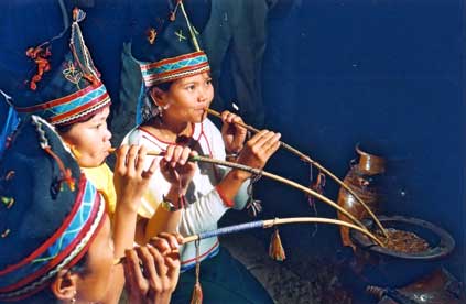 Trong căn nhà dài truyền thống cách điệu in dấu chế độ mẫu hệ, chủ nhà mang ra một bó cần trúc hoặc mây rừng chuốt bóng. Nếu là nhà giàu thuộc dòng quyền quí từ xưa còn có những cần dài tới 3 – 4 mét, cần được trang trí thêm những lục lạc làm bằng đuôi nhím để tạo ra âm thanh vui tai khi chuyển cần mới rượu. Thân của cần được chạm khắc nhiều hình thú nhỏ và những tượng kỳ hà?