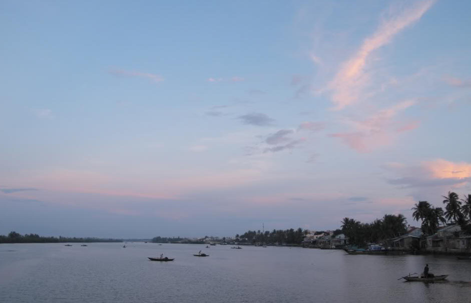Thuyền hướng ra cửaĐại, gió sông mát mẻ dễchịu như muốn vuốt ve người ở xa về, qua khỏi cầu Cẩm Nam, mọi người đều thíchthú yên lặng thở bầu không khí trong lành trên sông vắng, lòng mình chợt thấy êm đềm làm sao! Xa xa nhìn về hướng cửa Đại một vết nắng nhạt màu cam ửng hiện sau một khối đen kiến trúc có vẻ huyền bí dọc theo sông bên tay phải do nhà cửa, cây cối ven sông kết liền nhau, báo hiệu mặt trời đang lên...