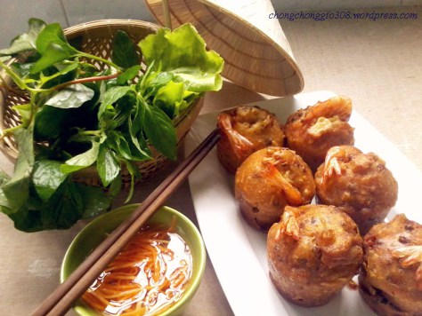 Sau đó chuẩn bị chảo loại sâu lòng. Dầu ăn cho vào chảo phải đủ ngập một cái cống. Chờ cho dầu sôi, người ta cho ít bột vào cống, sau đó cho vào một muỗng đậu xanh và thịt làm nhân bánh. Đổ thêm trên nhân bánh một lớp bột. Sau cùng để lên đó một vài con tôm. Nhúng cống ngập trong dầu đang sôi riu riu trong chảo. Lửa nhỏ bánh mới giòn đều từ ngoài vào trong. Chờ bánh chín vàng rồi mới nhấc cống ra, khéo léo đổ bánh ra đĩa.