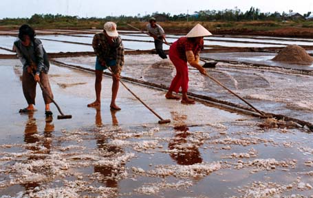 Tôi đến thăm ruộng muối (diêm điền) vào một ngày cuối tháng hai âm lịch, nông dân đã bắt đầu việc khai thác muối từ tháng giêng. Tại sao từ tháng giêng? Ông Hai Cư chủ ruộng muối trả lời thật dễ hiểu: “Trong nước biển lúc nào cũng có muối, lấy muối từ nước biển lúc nào cũng được, nhưng muốn lấy muối từ ruộng phải chờ đến tháng giêng trời thôi mưa, lại có nắng, nước biển mới bốc hơi, ruộng khô, muối mới kết tinh, trước tháng giêng trời còn mưa, ruộng bị chèm nhẹp hoài...”.