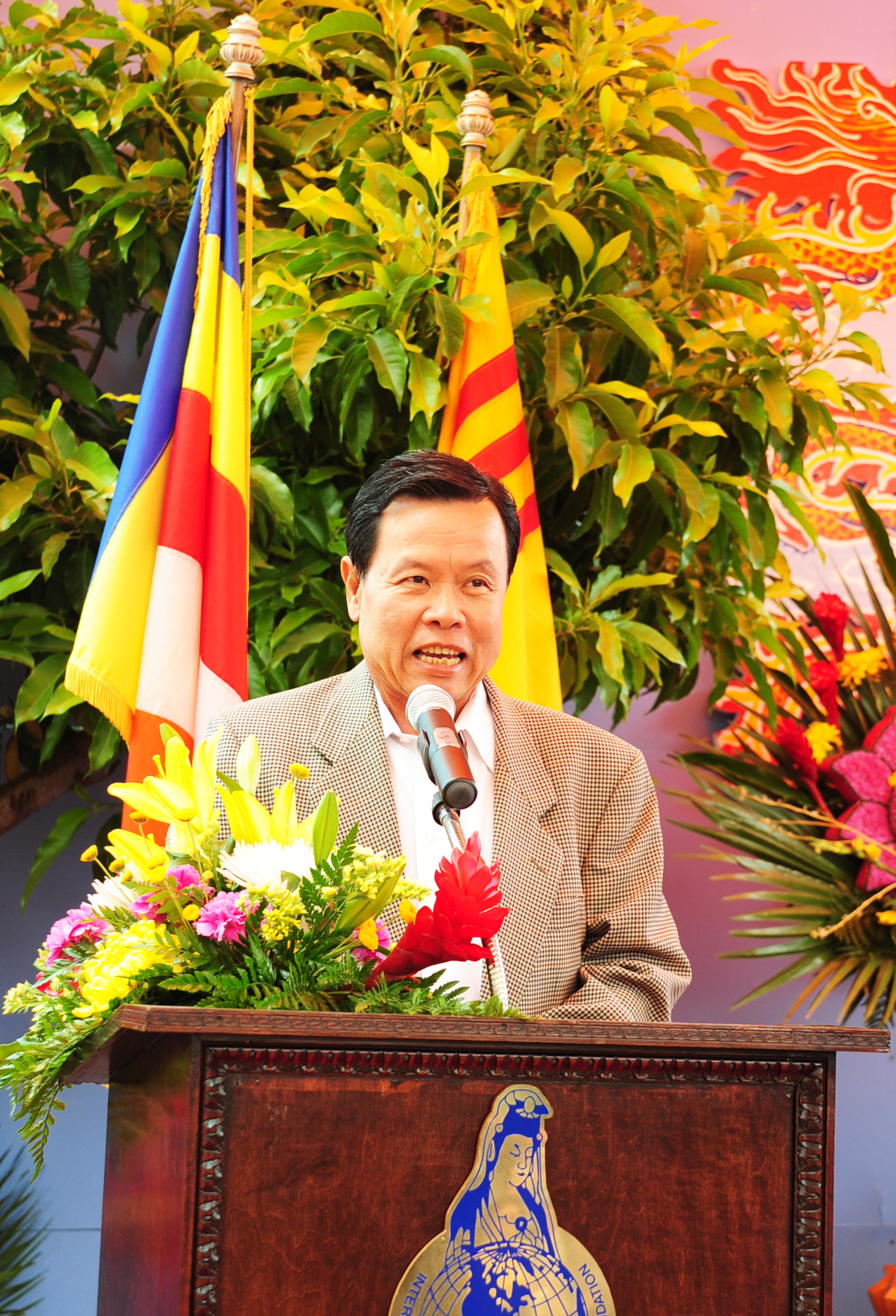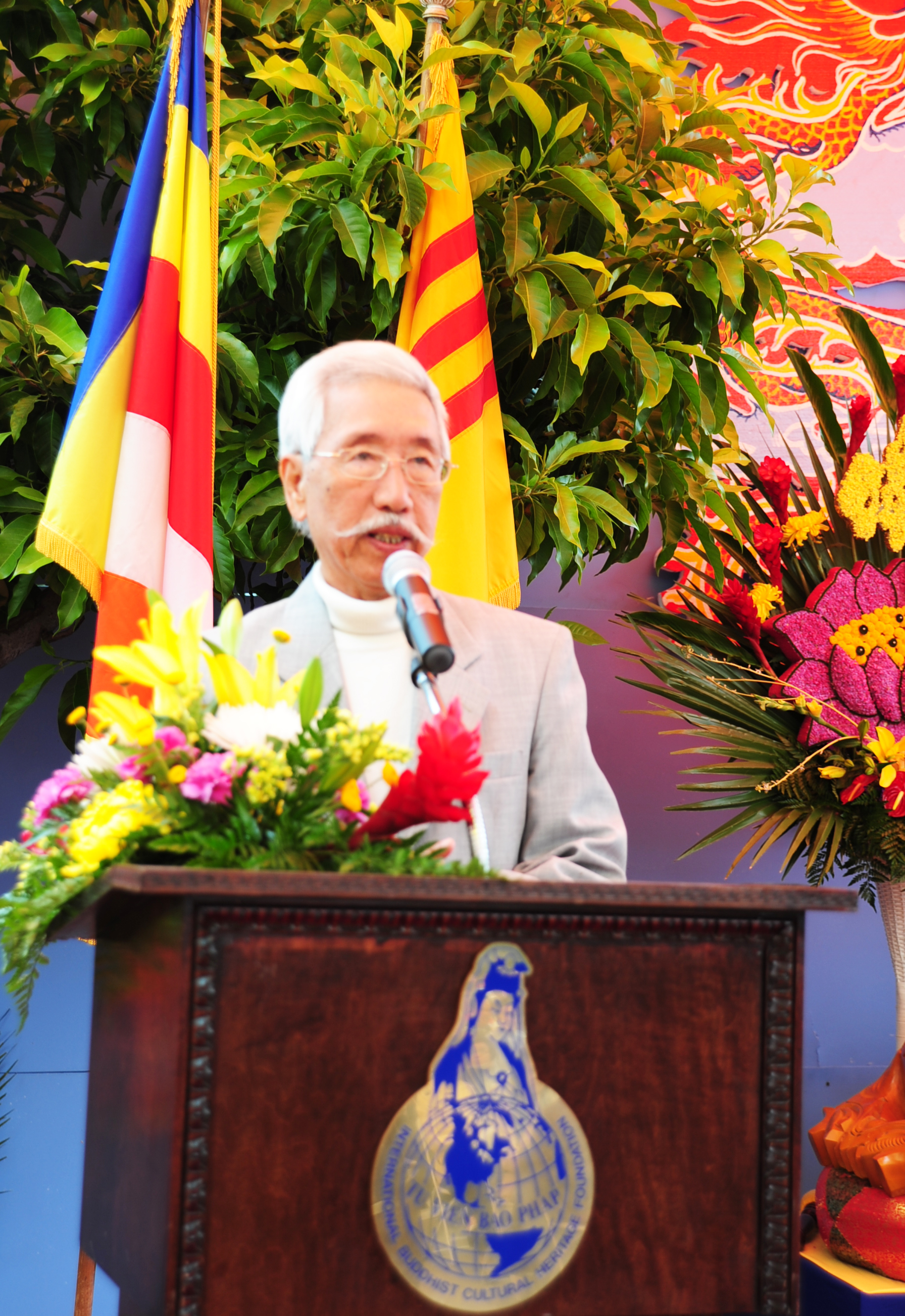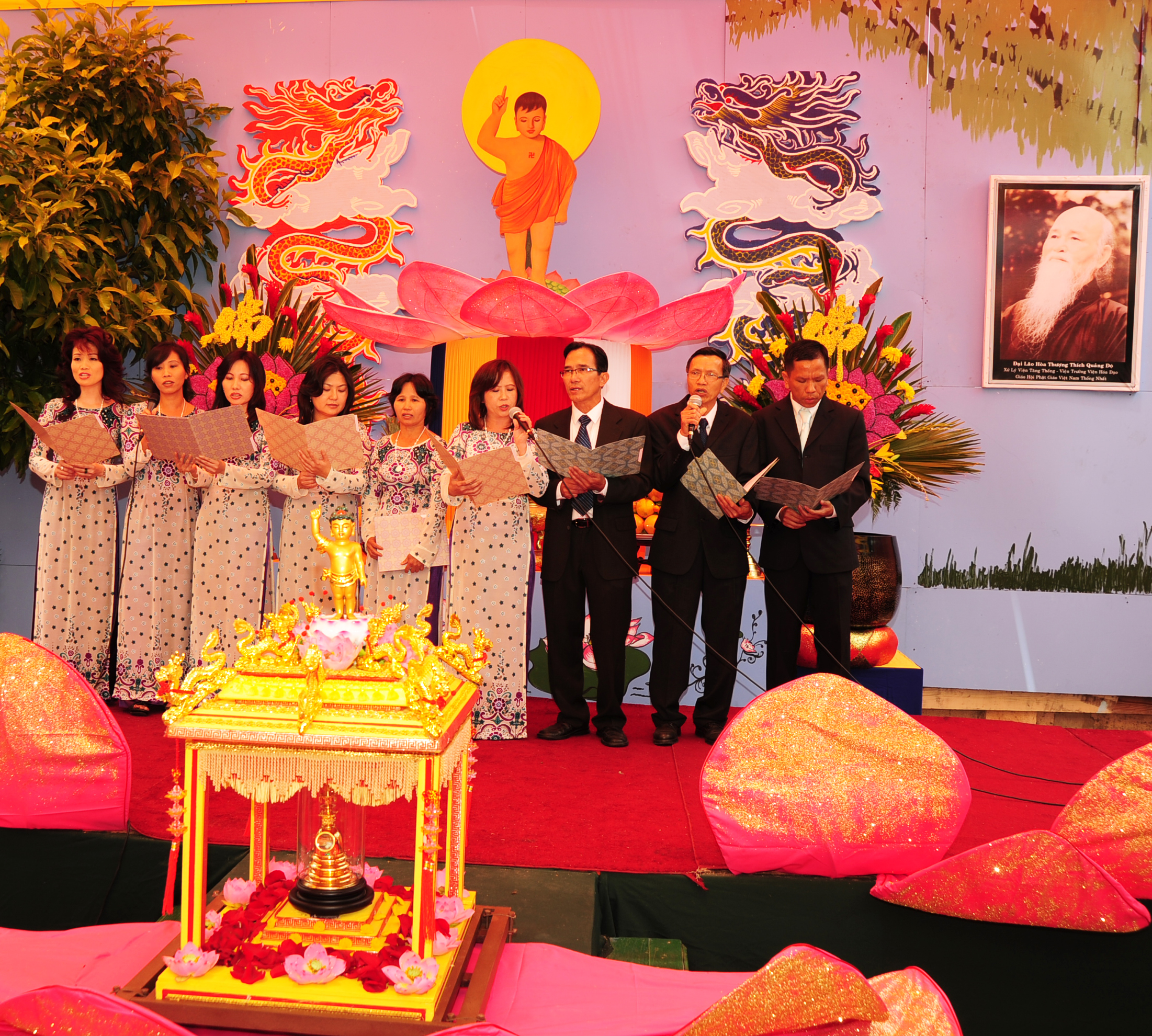 Sân khấu thiết kế ảnh Phật, hoa sen và rồng phượng màu sắc rất trang nhã, nhưng rất trang nghiêm khiến lòng mọi người thanh tịnh, hướng vềĐấng Chí Tôn và Phật Pháp. Một bàn nhỏ trên sân khấu với khăn vàng phủ lên làm buổi lễ tăng thêm phần long trọng, và ba vị là Hòa Thượng Thích Viên Thành, Thượng Tọa Thích Viên Thông, Thích Thiện Ân - người Hoa Kỳ, đã thuyết pháp trước hàng ngàn Phật Tử lắng nghe… Từng câu hỏi của các Phật Tử do Nữ sĩ Ái Cầm đọc lên được quí Ngài giải đáp một cách mạch lạc… Mọi người hiểu rõ về cảnh, thân thế và sự ra đời của Đức Phật Thích Ca. Mở mắt chào đời Đức Phật đi trên bảy hoa sen( 7 nguyên lý bao gồm 3 thời gian và không gian-4 phương hướng là Đông, Tây, Nam và Bắc) một tay chỉ lên trời, một tay chỉ dưới đất. Trên là trời, dưới là đất và chính giữa là Chí Tôn duy nhất đạt đạo Giải Thoát.