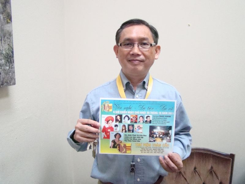 Trong khi tới thăm tòa soạn Việt Báo, nhà thơ Tâm Vô Lệ gửi lời mời đồng hương đến tham gia ủng hộ buổi gây quỹ cho Thư Viện Việt Nam Toàn Cầu, tổ chức vào ngày 30 Tây tháng 10 năm 2011 vào lúc 6 chiều tại nhà hàng Trường Sa (Paracel restaurant) 15583 Brookhurst St, Westminster, CA 92683.