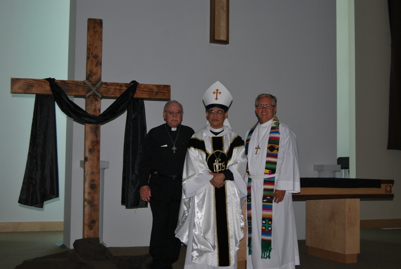 Trong hình từ phải: Mục Sư Steve Gilbertson, Đức Giám Mục Trần Thanh Vân và Mục Sư Frank Remski.