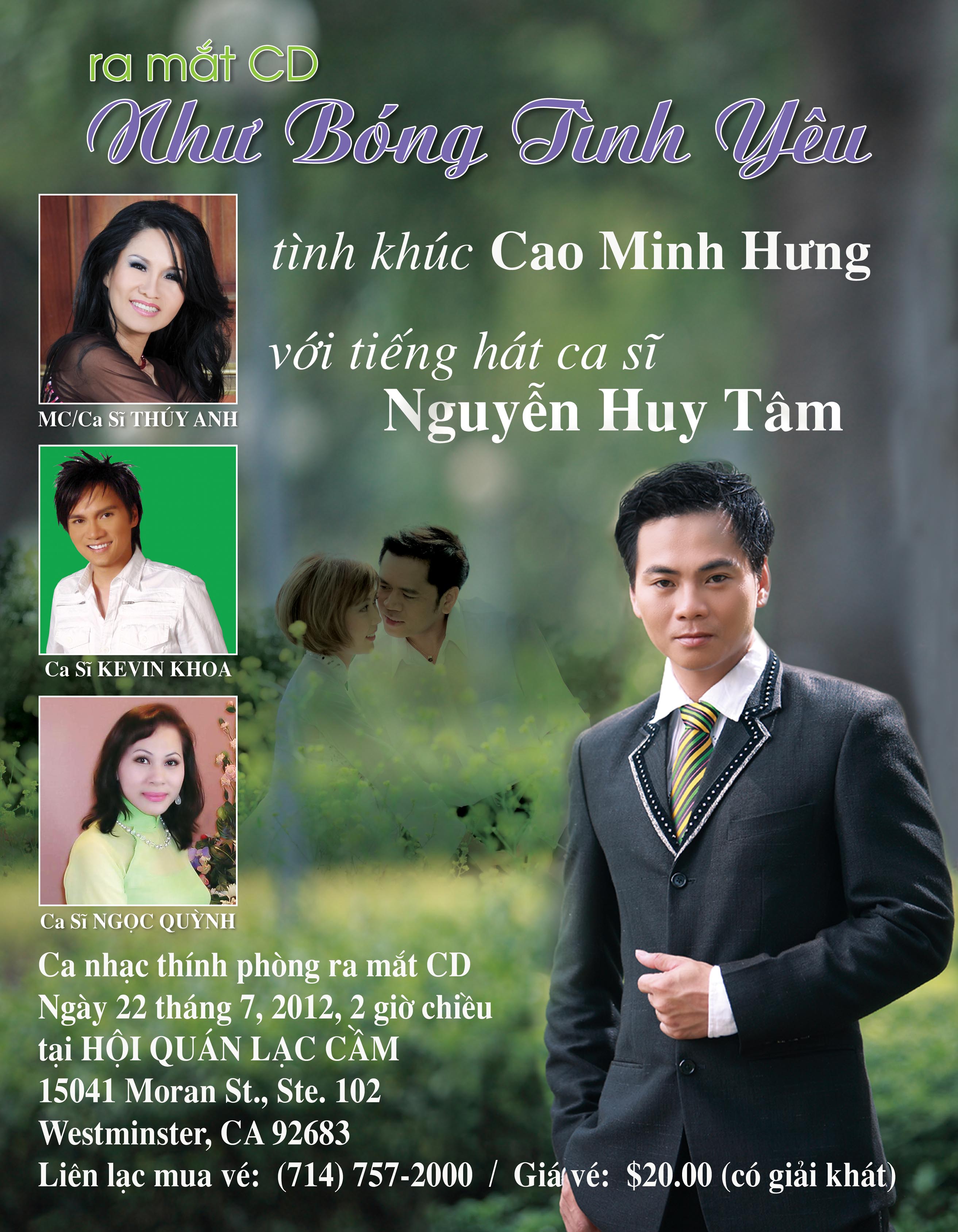 CD "Tình Khúc Cao Minh Hưng - Như Bóng Tình Yêu" sẽ được ra mắt vào ngày 22 tháng 7, lúc 2 giờ chiều tại Hội Quán Lạc Cầm với tiếng hát của ca sĩ Huy Tâm cùng một vài ca sĩ khác như ca sĩ Kevin Khoa, ca sĩ Ngọc Quỳnh và đặc biệt là sự góp mặt với tiếng hát vốn sở trường làm nũng qua lối trình diễn, nhưng dễ thương của ca sĩ/MC Thúy Anh với những bản nhạc vui tươi của nhạc sĩ Cao Minh Hưng mà giới thưởng ngoạn đã yêu thích như qua các bài như "Kẹo Hồng", "Chào Mùa Xuân Về",.... của Cao Minh Hưng. Được biết ca sĩ duyên dáng và nhí nhảnh Thúy Anh cũng sẽ đảm trách phần MC cho chương trình ngày ra mắt CD này.