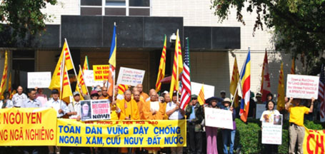 Los Angerles (Vân Giang) - Theo lời kêu gọi của Đức Đệ Ngũ Tăng Thống, Đại Lão Hòa Thượng Thích Quảng Độ về việc xuống đường biểu tình để chống ngoại xâm cứu nguy dân tộc, một cuộc biểu tình đã diễn ra vào lúc 10 giờ 30 sáng Chủ Nhật ngày 1 tháng 7 năm 2012 trước Lãnh Sự Quán Trung Cộng tại Los Angerles với hơn 500 đại diện các tôn giáo, các hội đoàn.