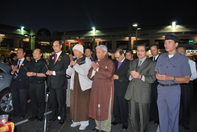 Lễ thắp nến bắt đầu, mọi người cầm trên tay một ngọn nến để cùng qúy vị lãnh đạo tinh thần lên trước bàn thờ Tổ Quốc, bên dưới có chân dung của Bà Đặng Thị Kim Liêng. Trong giây phút yên lặng Hòa Thượng Thích Minh Nguyện và Linh Mục Nguyễn Thái cùng các vị lãnh đạo tinh thần đọc lời cầu nguyện trong đêm tối với hàng trăm ngọn nến lung linh như để thắp sáng niềm tin trong công cuộc đấu tranh cho Tự Do, Dân Chủ, Nhân Quyền và toàn vẹn lãnh thổ tại quê hương sớm thành công.