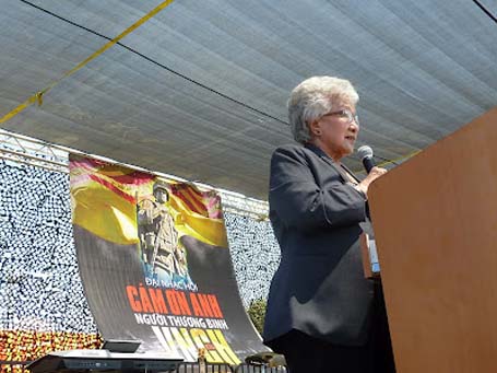 Chủ tịch hội H.O cứu trợ thương phế binh và quả phụ VNCH bà Hạnh Nhơn phát biểu: