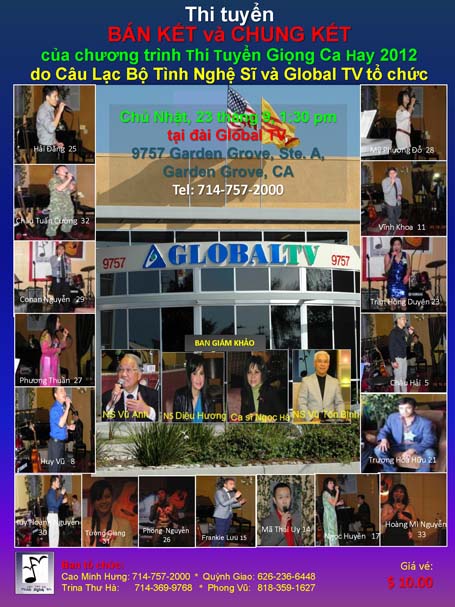 Câu Lạc Bộ Tình Nghệ Sĩ cũng đang rộn ràng tổ chức buổi thi tuyển vòng Bán Kết và Chung Kết vào ngày vào ngày Chủ Nhật, 23 tháng 9, lúc 1:30 pm tại studio của đài Global TV, địa chỉ 9757 Garden Grove, Ste. A, Garden Grove, CA. Từ lúc Giải thi tuyển được công bố trên báo chí đến nay, đã có hai cuộc thi Sơ Tuyển được tổ chức tại Hội Quán Âm Nhạc Lạc Cầm. Một vào ngày 18 tháng 3 và hai vào ngày 01 tháng 7, năm 2012.
