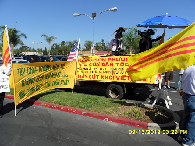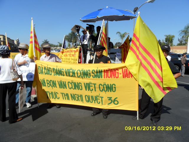 Theo chương trình thì cuộc biểu tình sẽ diễn ra vào lúc 1 giờ trưa chủ Nhật ngày 16 tháng 9 năm 2012 nhưng mới 11 giờ sáng rất đông quý đồng hương đã có mặt tại địa điểm biểu tình với cờ VNCH và Hoa Kỳ trên tay cùng các tấm biểu ngữ như: Đả Đảo Văn Công Việt Cọng, Đả Đảo Đảng Viên Cộng Sản Và Bọn văn Công Việt Cọng Thực Thi Nghị Quyết 36, Việt Cộng Cút Về Nước, Đả đảo Cộng Sản, Kỷ Nghệ Cộng Sản Việt Nam Bán Đất Tổ Tiên...