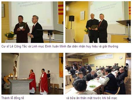 Cư Sĩ Lê Công Tắc, đại diện phái đoàn Phật Giáo Hoà Hảo tham dự buổi lễ, đã lên nhận giải thay cho tu sĩ Thanh Liêm và Linh Mục Đinh Xuân Minh, chánh xứ Frankfurt-Harheim, đã nhận thay cho Giáo điểm Con Cuông.