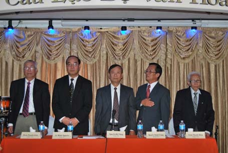 Trên bàn chủ tọa từ trái : Luật Sư Nguyễn Thanh Liêm, Tiến Sĩ Lê Minh Nguyên, Tiến Sĩ Nguyễn Bá Tùng, Giáo Sư Nguyễn Thanh Trang, Luật Gia Trần Thanh Hiệp.