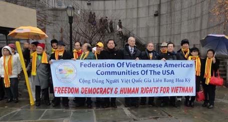 Mùa Đông ở Bắc Mỹ thời tiết rất lạnh lẽo, nhất là dưới cơn mưa lất phất, và hôm nay là ngày Thứ Hai, ngày làm việc mà có hơn hai trăm người từ nhiều tiểu bang ở Hoa Kỳ, Âu Châu về tham dự cuộc biểu tình. Điều này cho thấy khí thế đấu tranh, tinh thần chống bạo quyền CSVN của đồng bào ở hải ngoại lên cao độ. Hiện diện trong cuộc biểu tình gồm có phái đoàn Montreal, New Hamshire, Connecticut, Massachusettes, New York, New Jersey, Pennsylvania, Phila, Hoa Thịnh Đốn, Maryland, Virgìna, Georgia, Oregon, Dallas Texas, Florida, New Orlean, Nam Cali, Âu Châu, Hội Thánh Cao Đài Tây Ninh.
