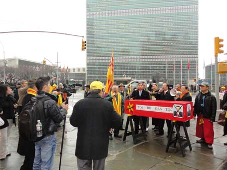 Một phái đoàn đại diện Người Việt đã vào Trụ sở Liên Hiệp Quốc để gặp và trao thỉnh nguyện thư cho Bà Ann-Syauta, người Nam Dương, Quyền Trưởng phòng Nhân Quyền trong LHQ ở New York, từ 11AM tới 1Pm. Trong phái đoàn này có Luật Sư Nguyễn Thanh Phong, Chủ tịch CĐ New York, Bác sĩ Võ Đình Hữu, Chủ Tịch Hội Đồng Đại biểu CĐ Người Việt Quốc Gia Liên Bang Hoa Kỳ; BS Đỗ văn Hội, Chủ Tịch Hội Đồng Chấp Hành NVQG LB HK, Giáo sư Lại Thế Hùng CĐ/ NVQG Âu Châu; Ông Lưu Tươi, Chủ Tịch CĐ Florida; Ông Cao Xuân Khải CT/CĐ New Hamshire, Ông Nguyễn Trung Châu, CT Tổng Hội Cựu Tù Nhân Chính Trị; Bà Lê Hương Mụi, Cao Đài; Ông Trần Viết Hùng Cao Đài, Ông Hùng Anh, đại diện Đài phát thanh “Tiếng Nước Tôi” ở Georgia; Cô Tara Thu, Phó CT/ Ngoại vụ CĐ New York.