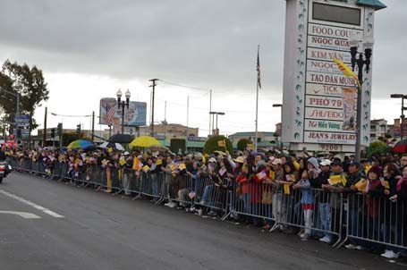 Từ sáng sớm rất đông đồng hương từ khắp nơi đã đổ về đứng dọc đường chuẩn bị xem diễn hành, một cơn mưa nhẹ chợt đến nhưng không làm nản lòng người, cơn mưa tạnh số lượng người đến mỗi lúc một đông.