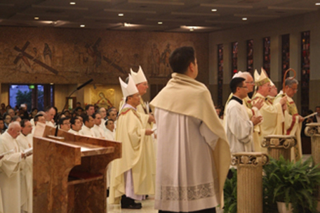 Thánh lễ có hàng ngàn tu sĩ và giáo dân trong Giáo Phận Orange tham dự. Đúng 5 giờ 30, Đức Giám Mục chủ tế, các Giám Mục và Linh Mục đoàn đồng tế tiến vào thánh đường. Tất cả các vị Giám Mục, Linh Mục, Phó tế đều mặc phẩm phục trắng. Trong số trên 300 Linh Mục tham dự, chúng tôi thấy có Linh Mục Nguyễn Uy Sỹ , nguyên Giám Đốc Trung Tâm Công Giáo VN. Trong một tai nạn xe gắn máy trước đây đã làm Linh Mục bị gẫy xương và nay vẫn còn phải di chuyển bằng nạng. Mở đầu Nhạc Trưởng, Tiến sĩ Âm Nhạc Patricia Lamb điều khiển dàn nhạc và ca đoàn trổi bài ca Nhập lễ "Laudate, Laudate Dominum" của nhạc sĩ Christopher Walker. Sau đó, Thánh lễ bắt đầu với Nghi Thức Thống Hối. Kinh Vinh Danh và Lời Nguyện Giáo Dân đều dùng ba ngôn ngữ Anh, Tây Ban Nha và Việt Nam.