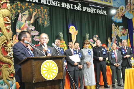 Sau đó, các vị Dân cử được mời lên sân khấu, sau khi Thị Trưởng Trí Tạ nói về ý nghĩa Tứ Diệu Đế và gửi lời cầu nguyện cho Việt Nam sớm có dân chủ, nghị viên Contreras nói vài lời chúc bằng Việt ngữ (được Phật Tử vỗ tay, hoan hô nồng nhiệt).