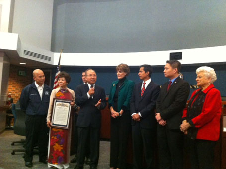 Công Bố Bản Vinh Danh Chánh Án Nguyễn Trọng Nho tại Hội Đồng Thành Phố Westminster. Ảnh của Bs Cao Minh Hưng.