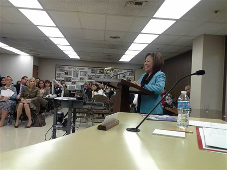 Giáo sư Nguyễn Lâm Kim Oanh thuyết trình tại phiên họp của Hội Đồng Giáo Dục Garden Grove về Sinh Ngữ Song Hành chiều Thứ Ba 3-12-2013.