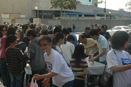 (Santa Ana, Calif.) – Trong không khí vui mừng đón Giáng Sinh, gần 50 bạn trẻ từ Văn Phòng Giới Trẻ và nhiều đoàn thể bạn đã phân phát gần 300 phần ăn cho người vô gia cư tại khu vực Tòa Thị Chính Santa Ana vào trưa ngày Chủ Nhật, 15 tháng 12. Bữa ăn trưa có các món ăn Mỹ Việt như spaghetty, salad, gà nướng, thịt xay nướng, chả giò, bánh và nước ngọt. Bữa ăn trưa còn có thêm cả ban nhạc để hát nhạc Noel, bốc thăm phát quà Noel, và hớt tóc miễn phí cho những người vô gia cư.