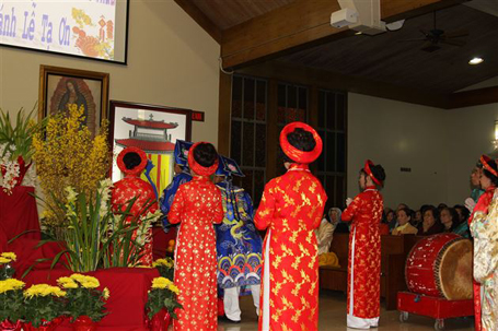 Các tín hữu đã đến tham dự thánh lễ Tạ Ơn Thiên Chúa trong năm cũ và cầu bình an cho năm mới. Trước thánh lễ, đội vũ phụng vụ trình bày một vũ khúc dâng lên Thiên Chúa. Sau đó, vị đại diện Ban Thường Vụ Cộng Đoàn trình bày ý nghĩa buổi lễ, ông nói "Đã 39 năm lưu lạc nơi xứ người, nhưng tâm trí người Việt khắp nơi tại hải ngoại đều hướng lòng về quê hương, và cùng nhau cử hành các nghi thức dâng hương, tế lễ cổ truyền để Tạ Ơn Thiên Chúa, cầu xin cho năm mới được nhiều Phúc, Lộc và bình an. Linh mục chủ tế Trần Văn Kiểm chúc Tết mọi người, xin Chúa ban bình an, sức khỏe và cuộc sống an vui, thịnh vượng, và Thánh lễ được mở đầu với bài ca nhập lễ do ca đoàn giáo xứ phụ trách. Mọi người sốt sắng tham dự Thánh lễ.