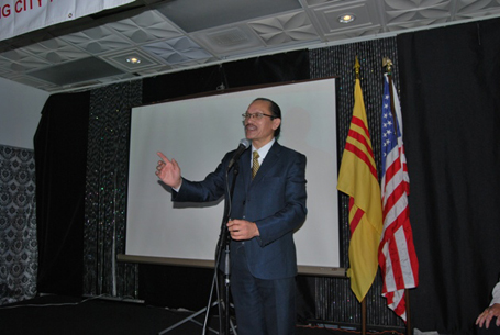 Sau phần nghi thức chào quốc kỳ và phút mặc niệm, LS Nguyễn Tâm lên ngỏ lời chào mừng và cảm ơn sự hiện diện, và cho biết mục đích ra tranh cử Nghị Viên: