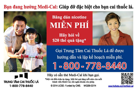 Thêm một khích lệ để gọi cho Trung Tâm Cai Thuốc Lá là thành viên Medi-Cal có thể nhận được $20 thẻ quà tặng. Để hội đủ điều kiện nhận cả băng dán và thẻ quà tặng, người gọi cần có thẻ Medi-Cal hợp lệ và hoàn tất cuộc tư vấn đầu tiên. Muốn biết thêm chi tiết, xin vào trang mạng www.NoButts.org/Viet/medi-cal/.