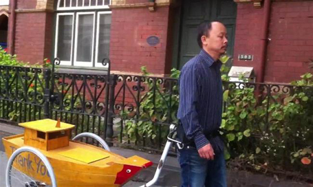MELBOURNE, Úc Châu - Tri Nguyen đang trên chuyến đi bộ từ Melbourne tới Canberra, kéo theo sau lưng là một chiếc ghe gỗ trong cuộc chiến gây ý thức mơ2ời gọi đô1i xử tử tế với thuyền nhân.