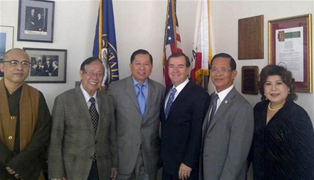 Phái đoàn Quận Cam gặp DB Ed Royce (thứ 3 từ phải) để xin giữ giờ Việt ngữ của đàì RFA. Bên trái là HT Thích Viên Lý. Từ phải qua là Bà Nguyễn Minh Nguyệt và Nguyễn Thanh Trang.