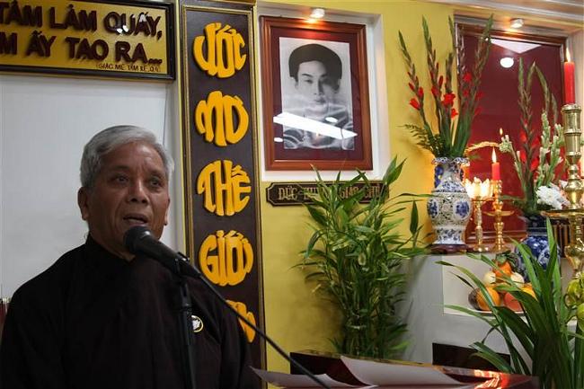 Sau đó Giáo Sư Nguyễn Thanh Giàu Hội Trưởng Hội PGHH Nam California lên nói về ý nghĩa ngày Đức Thầy thọ vắng mặt, ông cho biết.: "….Năm xưa cách đây 66 năm một biến cố trọng đại lịch sử nhắc đến ngày nầy toàn thể tín đồ đều xúc động bùi ngùi và ông cũng đã nhắc lại những sự kiện liên quan đến lịch sử đến đức Huỳnh Giáo Chủ đối với quê hương đất nước nhất là đối với các tín đồ đồng đạo, Sau ngày khai đạo, chỉ với thời gian vài năm ngắn ngủi, số tín đồ tin theo và quy y với Đức Thầy lên đến gần 2 triệu người, trong khi dân số toàn miền Nam lúc bấy giờ chỉ khoảng 10 triệu người. Điều này đã làm cho Việt Minh Cộng Sản lo ngại, cho nên họ đã âm mưu ám hại Ngài trong một phiên họp do chính họ mời Ngài đến vào ngày 25 tháng 2 nhuần, năm Đinh Hợi, tức ngày 16 tháng 4, 1947, tại Dốc Vàng, tỉnh Kiến Phong... Trong nhà ông Mười Đủ, Bửu Vinh đã bố trí đặt cây súng máy ngoài sân kiểng ghim họng ngay chỗ Đức Thầy ngồi. Ngài bước vào, bốn phòng vệ bước theo đứng 4 góc, Ngài ngồi ghế giữa, y ngồi một bên, liền đó 8 người lính của y bước vào, cứ 2 người đứng cặp kè một phòng vệ. Trong lúc bàn cãi, Bửu Vinh dằn mạnh ly nước xuống bàn rồi ngã ngửa ra, tức thì loạt súng máy nổ ngay Đức Thầy. Ngài lẹ tay quạt tắt đèn, nhờ đó anh Mười Tỷ hụp xuống, 2 người lính của Vinh đâm nhầm nhau, ba người cận vệ chết hết, anh Mười Tỷ thoát nạn chạy thoát... Khi đèn thắp sáng, Đức Thầy lăn ra vô sự với cái ghế che thân đang nằm cạnh bàn thờ Cửu Huyền... Sau đó Bửu Vinh mời Ngài trở lại văn phòng của y có lính bảo vệ. Nghe tiếng mõ và tù và nổi lên báo động khắp xóm làng, lính Bảo An, Tín Đồ kéo tới theo Thầy rất đông, Thầy đi một đoạn nói lớn ba lần: "Bà con về đi"... Bởi Đức Giáo Chủ quá thương xót đồng bào nhân loại, lúc nào cũng muốn đôi bên thôi xô xát lẫn nhau, nên sau khi hòa giải không được, Ngài mới chọn cách vắng mặt, ở lại trong sào huyệt của đối phương và còn ra lệnh: "án binh bất động.", để làm cho tín đồ ít chết vừa khiến cho đối phương yên tâm, bớt gây nghiệp sát hại người tu. Từ ngày ấy đến nay, Đức Thầy đã vắng mặt, tâm trạng của toàn thể tín đồ PGHH lúc nào cũng nhớ đến đấng Tôn sư, lúc nào cũng mong Ngài sớm trở về. Số phận của Đức Thầy ra sao? Ngài đã thực sự tạm thời vắng mặt theo thiên mệnh và Ngài sẽ trở về?... "